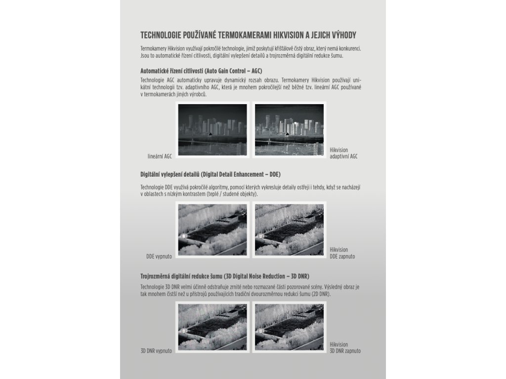 Automatické řízení citlivosti (AGC: Auto Gain Control): Technologie AGC automaticky upravuje dynamický rozsah obrazu. Termokamery Hikvision používají unikátní technologii tzv. adaptivního AGC, která je mnohem pokročilejší než běžné tzv. lineární AGC používané v termokamerách jiných výrobců.